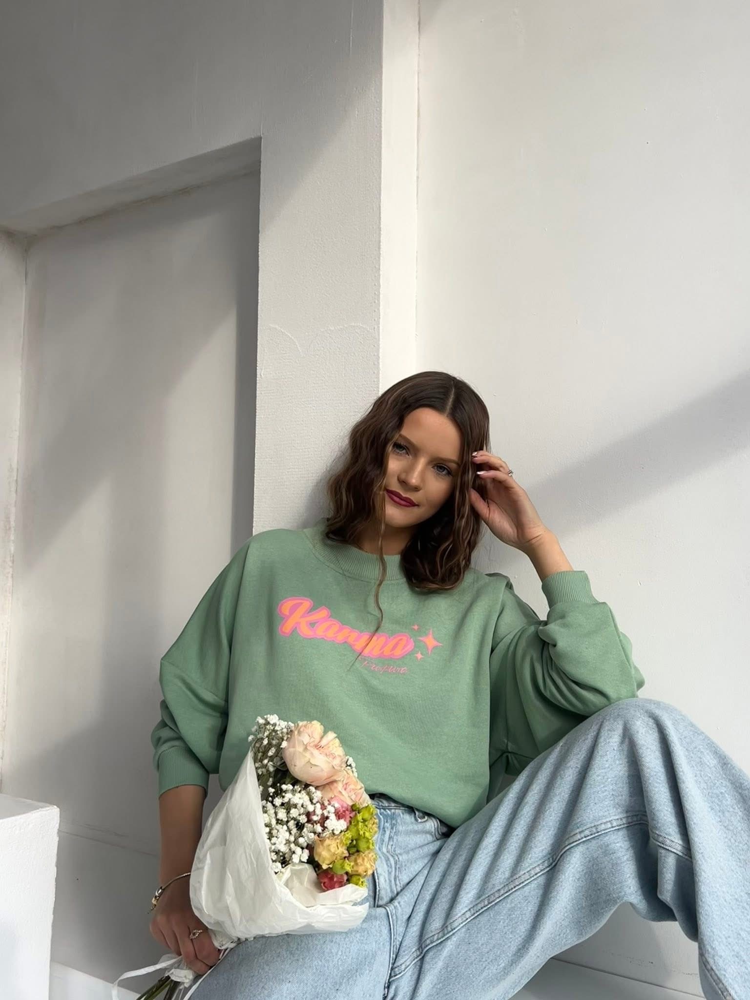 Stylowa bluza w modnym zielonym odcieniu z napisem Karma. Miękka, wygodna i idealna na co dzień.