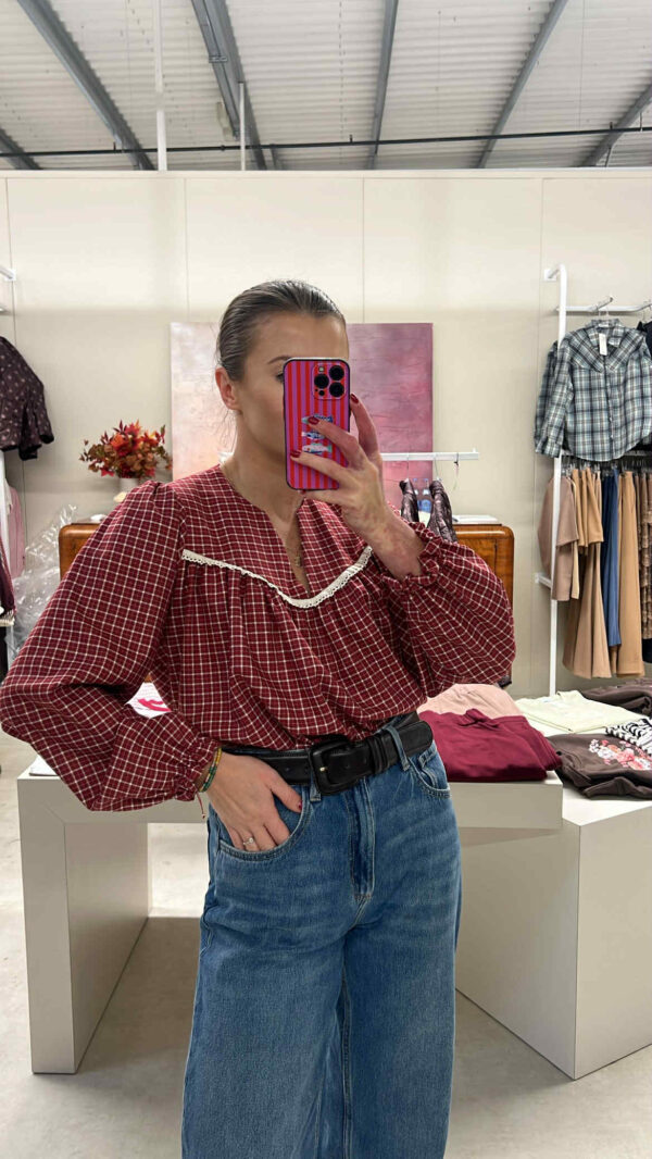 Bluzka o luźnym kroju z delikatnie bufiastymi rękawami zakończonymi elastycznym mankietem. Wykonana z miękkiej, przyjemnej w dotyku tkaniny w klasyczny wzór w kratę. Dekolt w kształcie litery V ozdobiony subtelną lamówką z koronki dodaje jej kobiecego charakteru. Idealna na co dzień – doskonale komponuje się zarówno ze spodniami, jak i spódnicą.