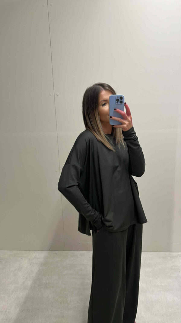Komplet Klarysa w ciemnej zieleni to połączenie minimalizmu i charakteru. Wyjątkowo miękka dzianina modalowa daje uczucie lekkości, a fason oversize zapewnia swobodę ruchów. To zestaw, który świetnie wpisuje się w styl „casual chic”, oferując komfort i elegancję w jednym.