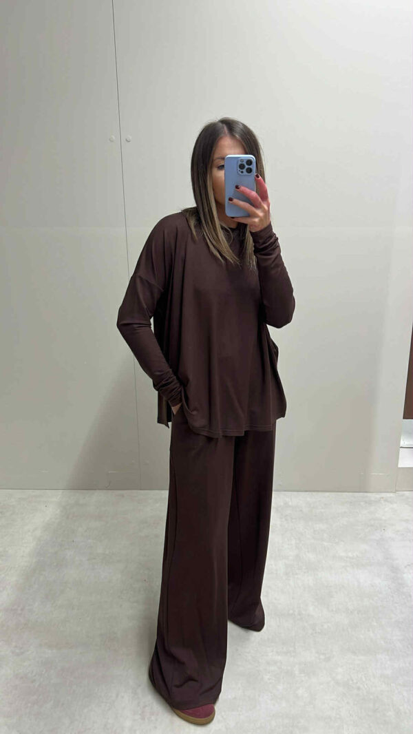 Czekoladowa Klarysa to wybór dla miłośniczek ciepłych barw i subtelnej elegancji. Dzianina modalowa gwarantuje miękkość i oddychalność, a swobodny krój nadaje lekkości sylwetce. To idealny zestaw, który łączy wygodę z klasyką – świetny na co dzień i na wyjątkowe okazje.