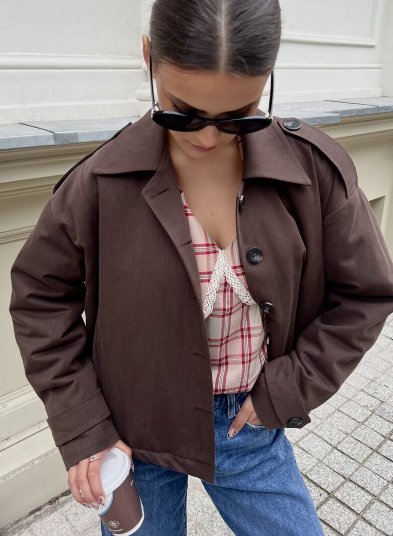 Stylowa kurtka w kolorze głębokiej czekolady – klasyk, który dodaje elegancji każdej stylizacji. Miękki materiał (50% wiskoza, 50% bawełna) i ocieplana podszewka gwarantują komfort w chłodniejsze dni. Fason one size świetnie dopasuje się do różnych sylwetek.