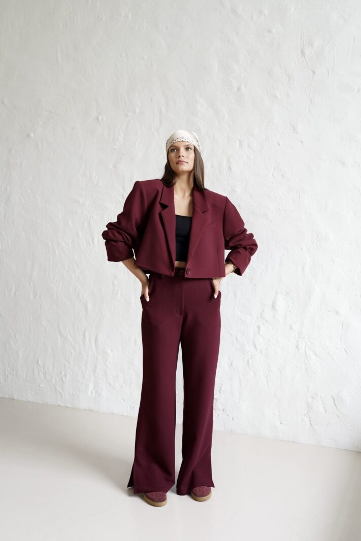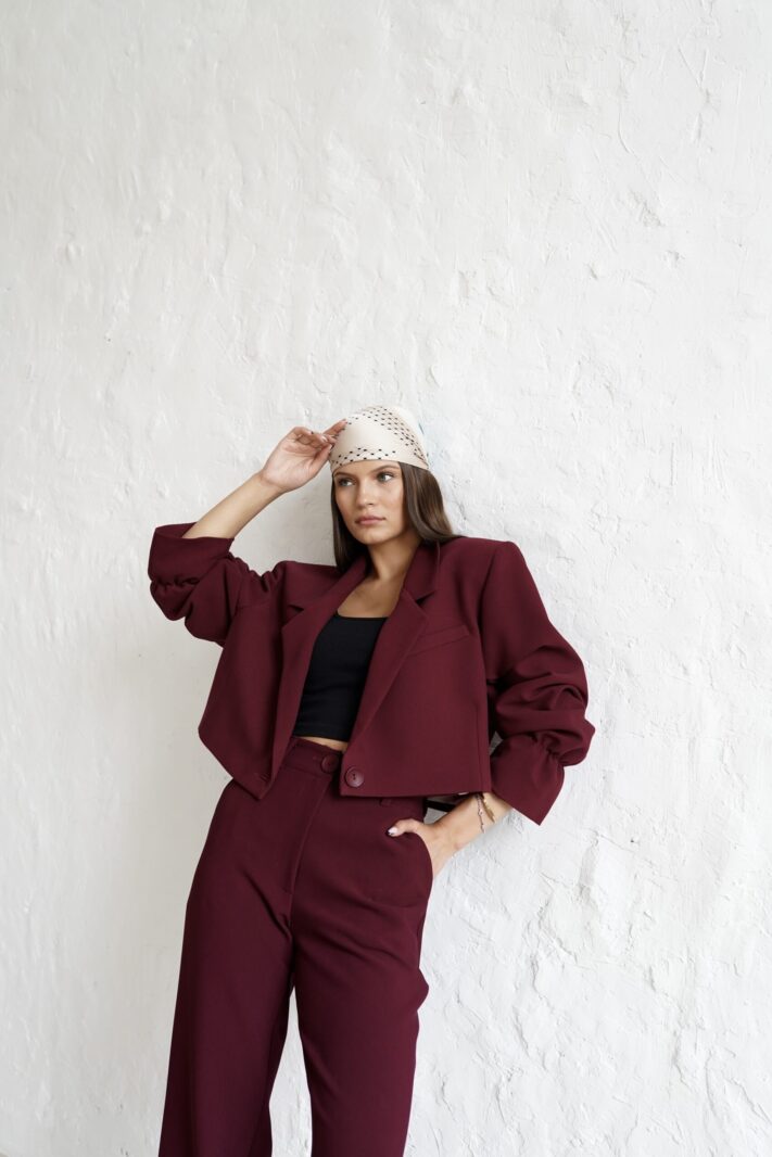 Marynarka Daga w kolorze głębokiego bordo to esencja nowoczesnej elegancji z nutą odwagi. Krótszy krój dodaje lekkości i świetnie komponuje się ze spodniami Zofia, tworząc garnitur, który sprawdzi się zarówno na spotkaniach biznesowych, jak i w wieczornym wydaniu.