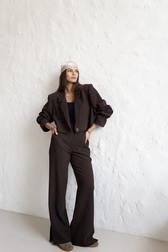 Czekoladowa marynarka Daga otula ciepłem i klasą. Jej fason z charakterem pozwala poczuć się stylowo i swobodnie jednocześnie. W zestawie ze spodniami Zofia daje efekt ponadczasowego kompletu, idealnego na codzienne wyjścia i bardziej oficjalne okazje.