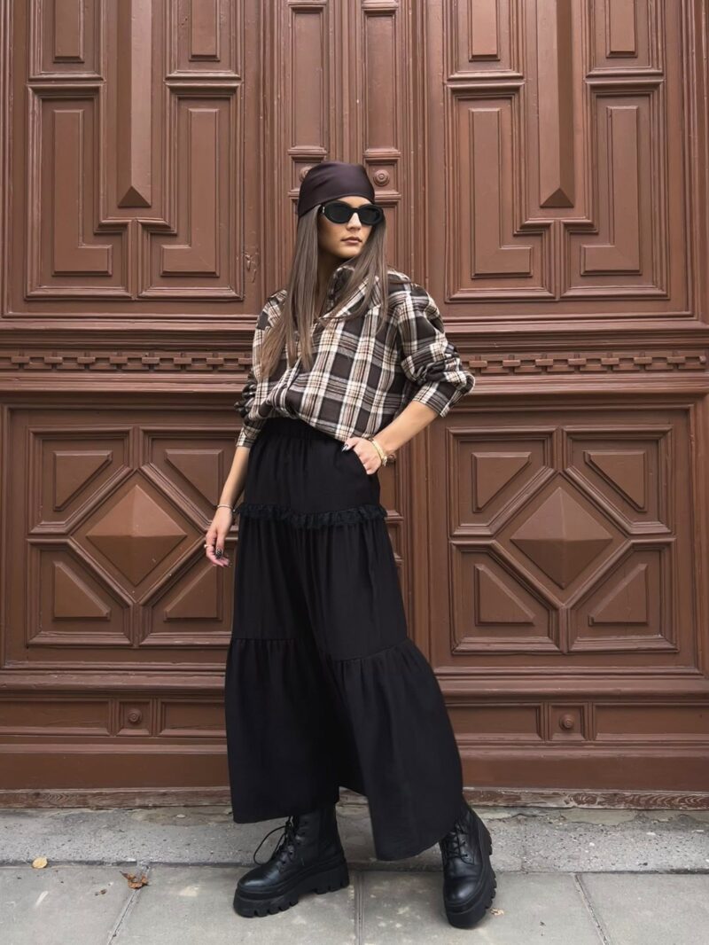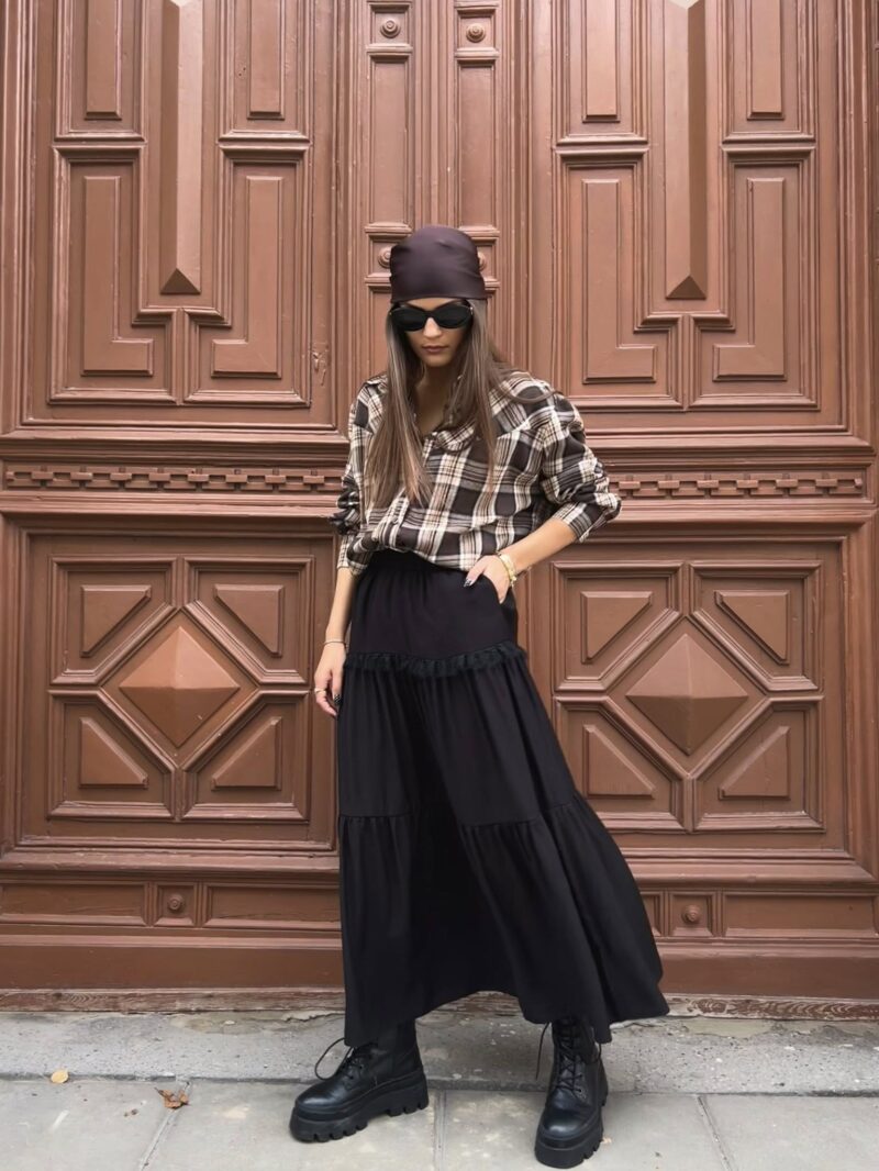 Lekka i wygodna czarna spódnica maxi z falbanami. Uniwersalny krój sprawia, że pasuje zarówno do sportowych stylizacji z trampkami czy workerami, jak i do bardziej eleganckich zestawów. Idealna baza do wielu outfitów przez cały rok.