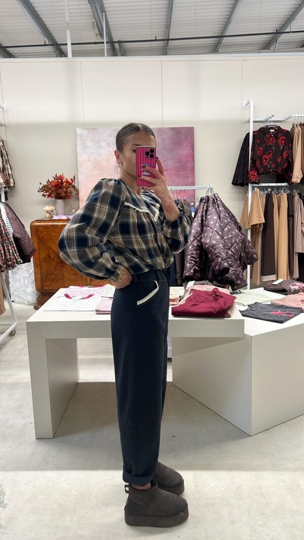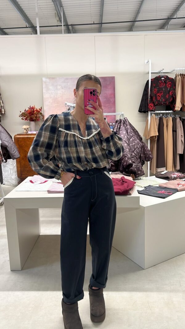 Granatowa wersja spodni Janka to klasyka z romantycznym akcentem. Wysoki stan i dopasowany krój podkreślają sylwetkę, a ozdobna koronka przy kieszeniach wprowadza elegancki detal. Świetne do zestawienia z białą koszulą lub lekkim golfem.