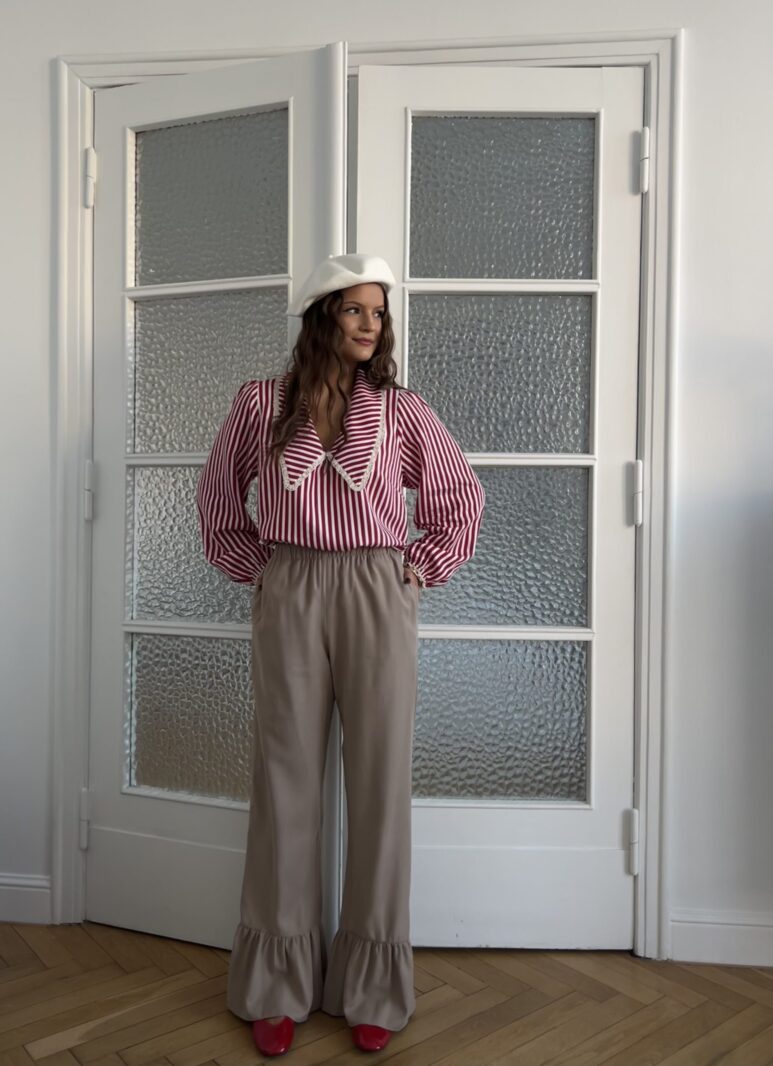 Eleganckie spodnie z szeroką nogawką i efektowną falbanką u dołu. Wysoki stan podkreśla talię, a lekki, lejący materiał zapewnia komfort i swobodę ruchów. Idealne zarówno do stylizacji codziennych, jak i bardziej eleganckich zestawów. Doskonały wybór dla kobiet ceniących modny, kobiecy fason.