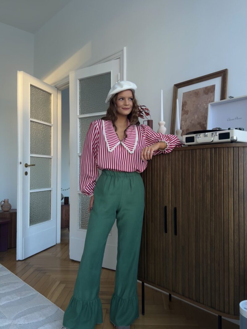 Eleganckie spodnie z szeroką nogawką i efektowną falbanką u dołu. Wysoki stan podkreśla talię, a lekki, lejący materiał zapewnia komfort i swobodę ruchów. Idealne zarówno do stylizacji codziennych, jak i bardziej eleganckich zestawów. Doskonały wybór dla kobiet ceniących modny, kobiecy fason.